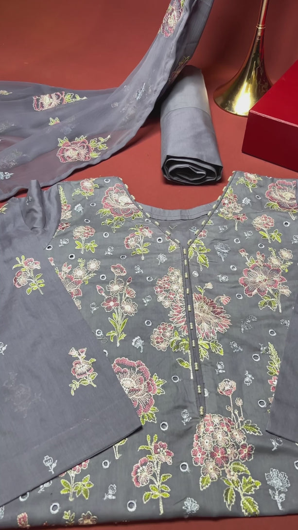 Elevate your ethnic wardrobe with our stunning grey floral embroidered kurta set. This exquisite three-piece stitched suit features a pearl based neckline, beautifully adorned with intricate embroidery all over the shirt that adds a touch of elegance. The matching loose trousers complements the kurta perfectly, while the pure bamber crinkle dupatta adds a luxurious finish to your look. Ideal for festive occasions or casual gatherings, this ensemble promises comfort and style.