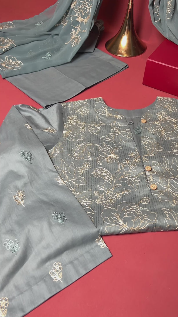 Embrace style and elegance effortlessly with this versatile grey 3-piece stitched suit, this ensemble boasts intricate embroidery on the shirt with button details on the neckline paired with loose trousers for ultimate comfort. Complete the look with a luxurious pure bamber crinkle dupatta, making it an ideal choice for both casual outings and special occasions.